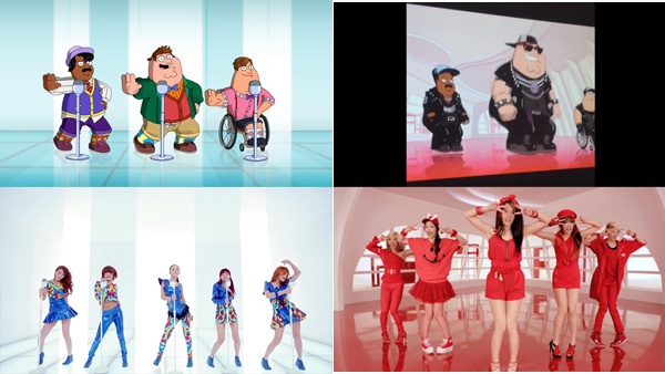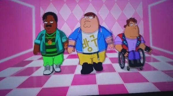 | Cảnh biểu diễn của 3 nhân vật Family Guy được dàn dựng khá giống 2 MV Kpop khác. |