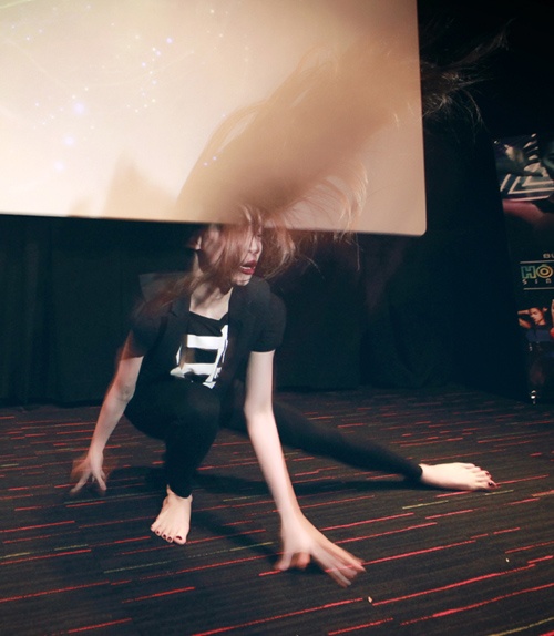 Hồ Ngọc Hà không ngần ngại cởi giày để đi chân đất khoe vũ đạo với các fan và giới truyền thông Hà thành. |