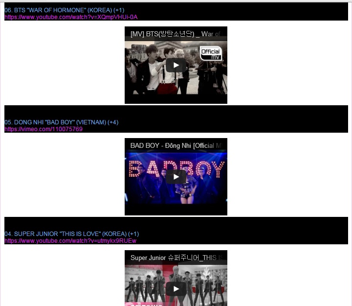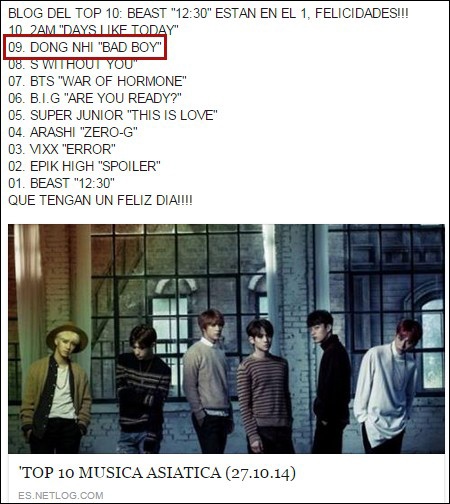 | MV Bad Boy trên BXH của blog Tây Ban Nha chuyên về âm nhạc châu Á. |