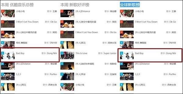 Tại đây, MV Bad Boy của Đông Nhi đã tạo bước đột phá lớn khi chiếm vị trí số 5 trong Top. Đặc biệt, sản phẩm âm nhạc mới nhất của giọng ca Lắng nghe tim em còn xuất sắc vượt qua cả Distance của Duy An Na, 1,2,3 của Purfles hay Steal My Girl của nhóm One Direction.