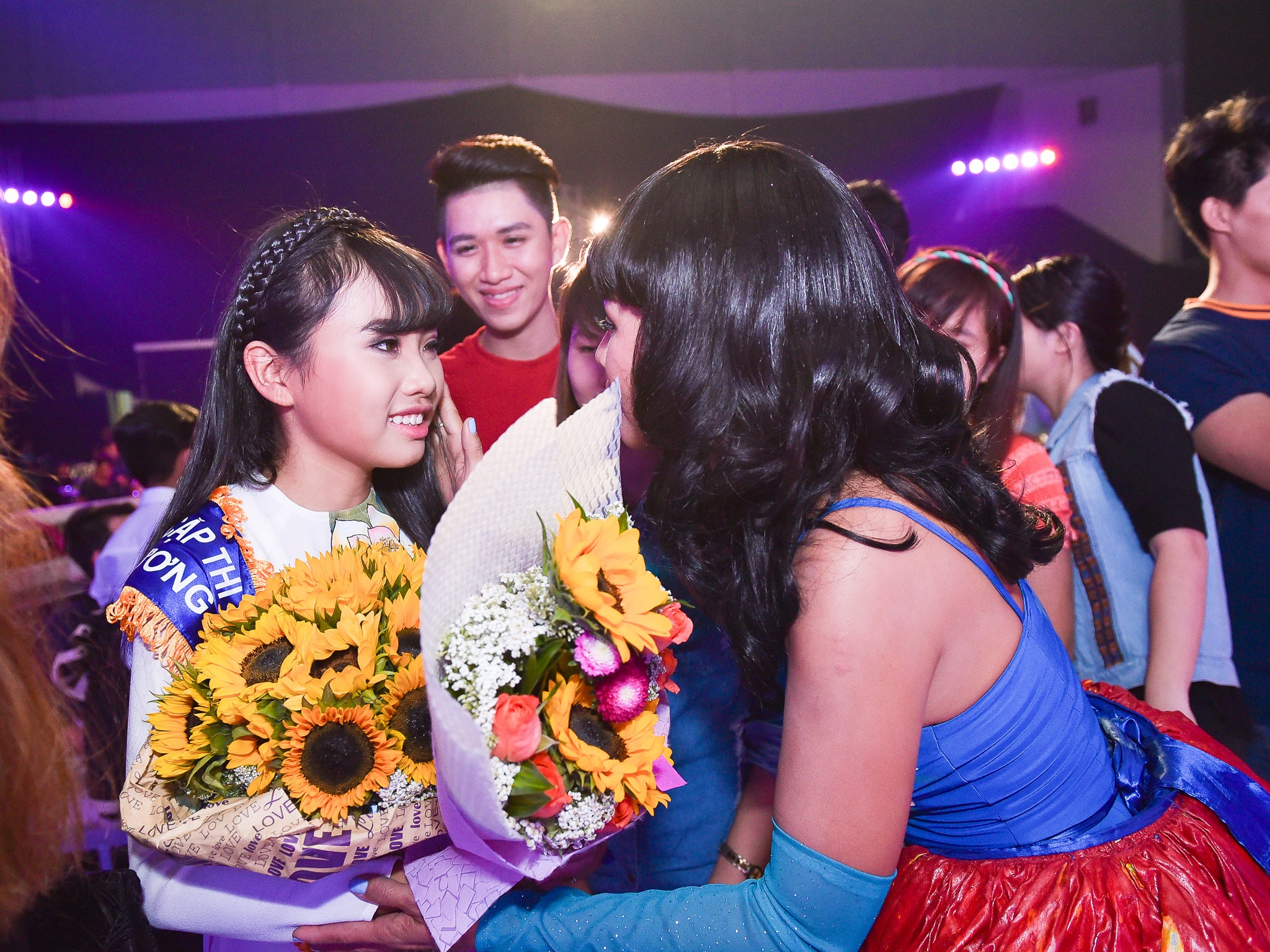 Thúy Uyên đến chúc mừng giọng ca nhí sau cuộc thi. |