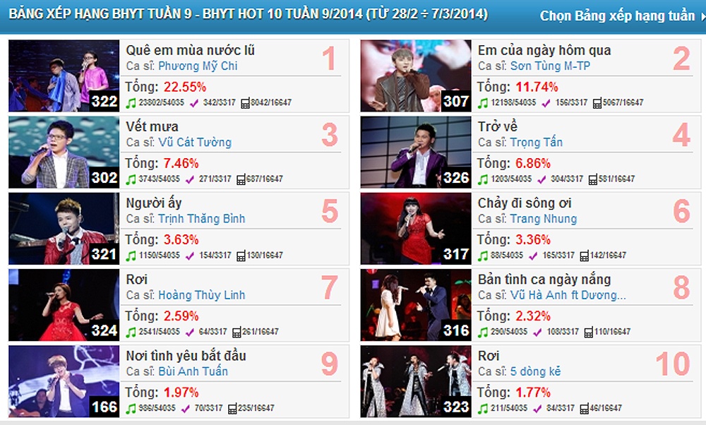 | Top 10 ca khúc được bình chọn nhiều nhất BHYT trong tuần 9. |