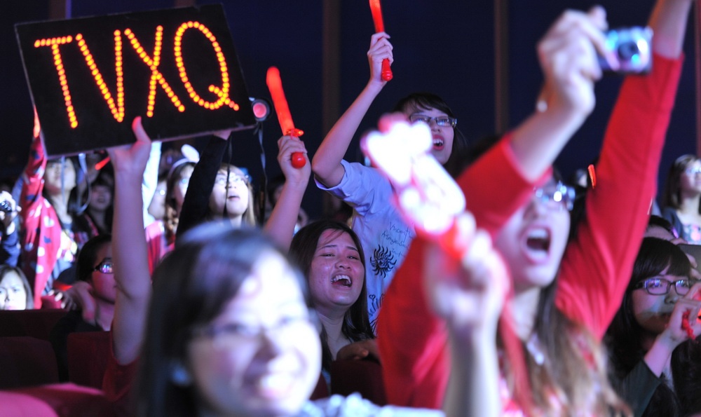 Các fan teen nhiệt tình hát và gọi tên JYJ cũng như TVXQ - nhóm nhạc tiền thân của bộ ba Jeajong - Yoochun và Junsu.