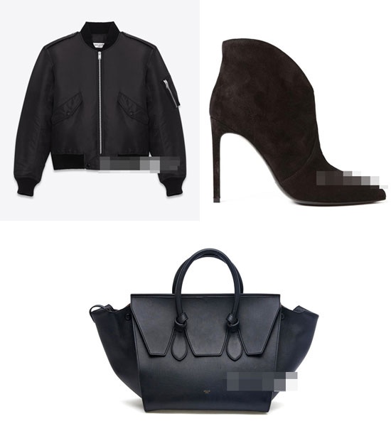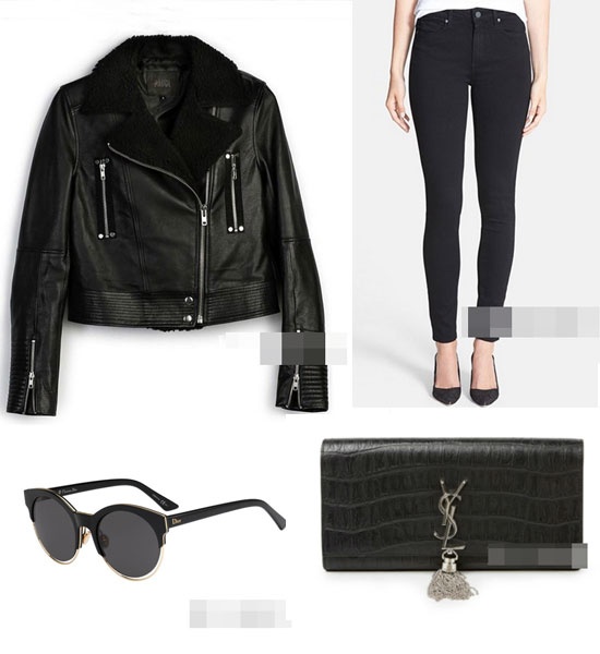 | Set hàng hiệu gồm: chiếc áo da, quần skinny của hiệu Paige, kính hiệu Dior và clutch của Yves Saint Laurent. |
