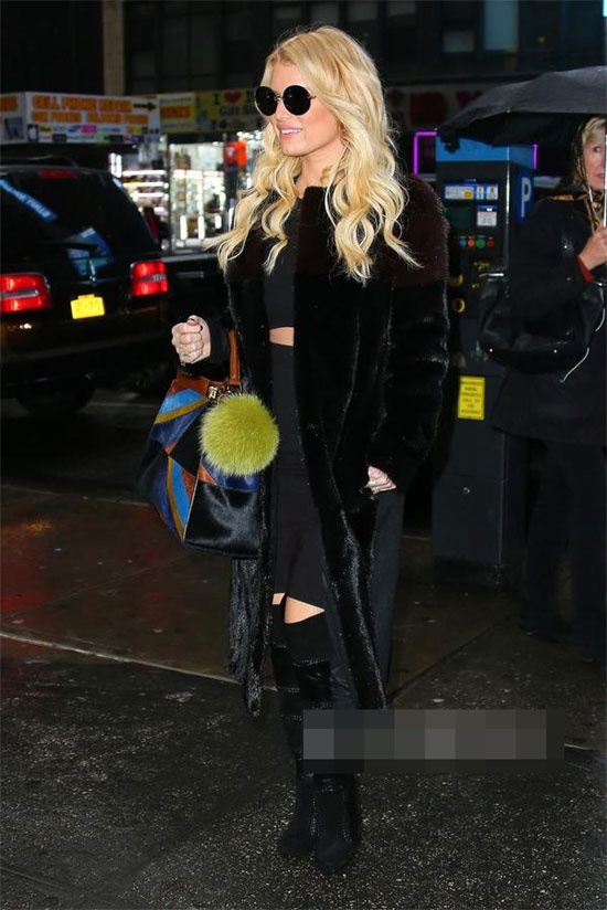 | Nữ ca sĩ Jessica Simpson thời thượng với đôi boots cao cổ hiệu Tom Ford, túi Fendi, kính Miu Miu. |