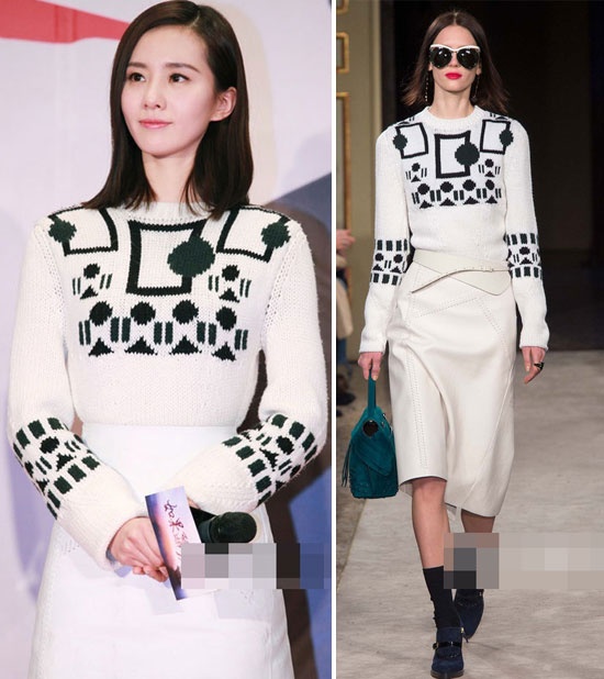| Lưu Thi Thi trang nhã và nền nã với váy trắng kết hợp áo len trắng họa tiết khi đi tham dự sự kiện. Bộ cánh thanh lịch này nằm trong bộ sưu tập của Tod's 2015. |
