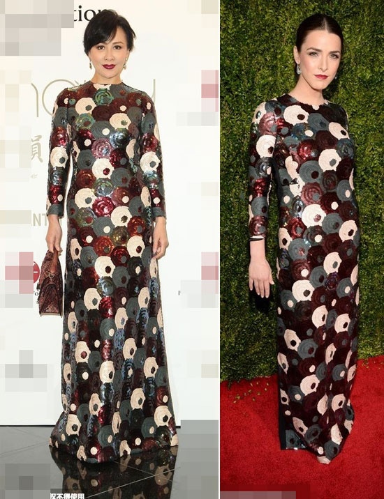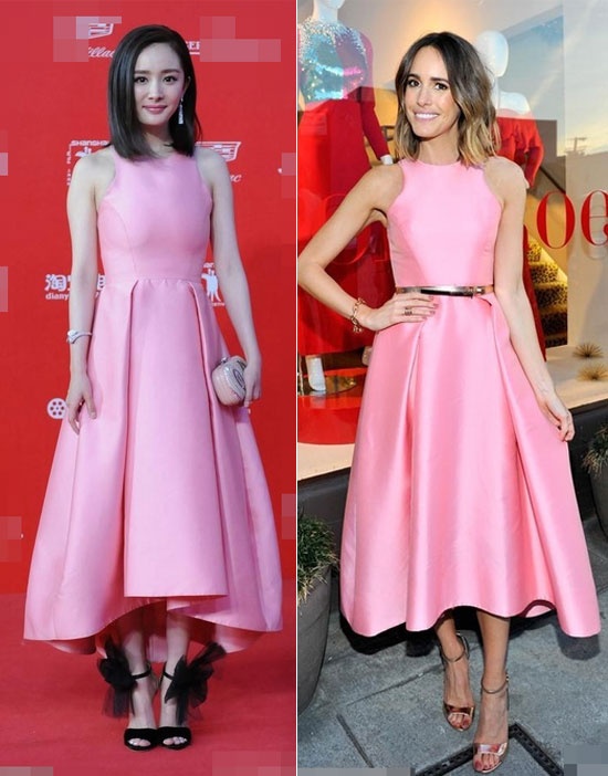 | Ở hai phương trời nhưng Dương Mịch và Louise Roe lại "đụng hàng" chiếc váy hồng không tay, dáng đuôi tôm khi đi tham dự các sự kiện. |
