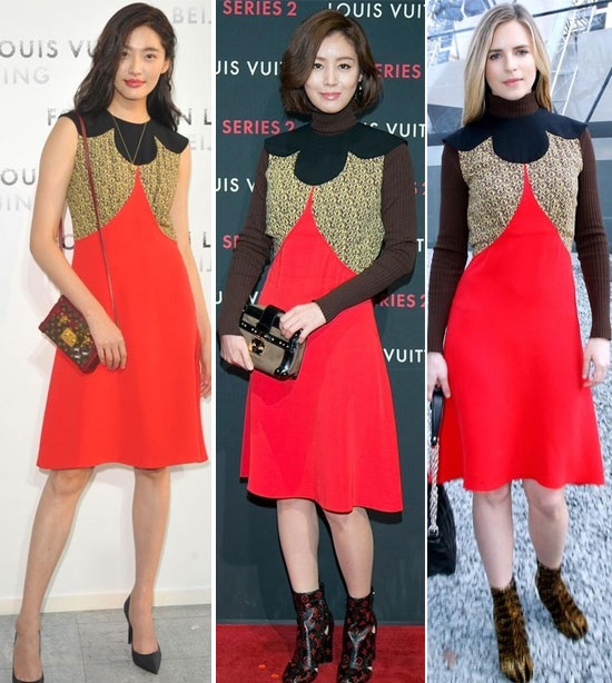 | Chân dài Trần Bích Khả - Kim Sung Ryung và Brit Marling yêu thích váy điệu đà của Louis Vuitton năm 2015. |