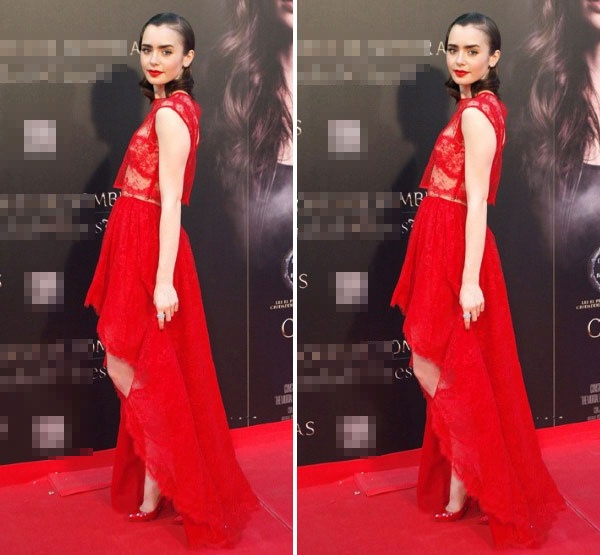 | Chiếc váy đuôi tôm màu đỏ, giày đỏ cùng son môi đỏ làm Lily Collins hút hồn mọi ánh nhìn. |