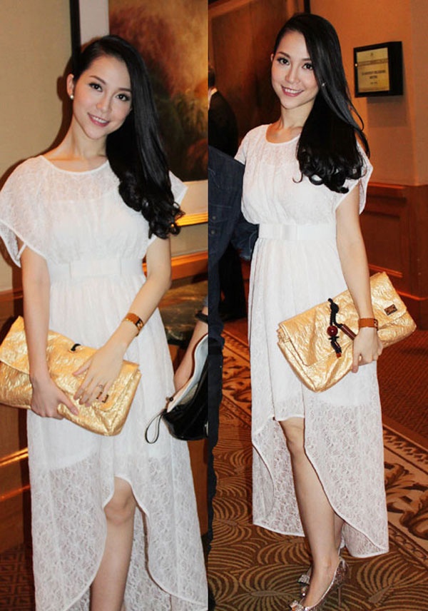 | Linh Nga trông rất yêu kiều và điệu đà với chiếc váy ren trắng đuôi tôm. Thêm chiếc ví cầm tay vàng nổi bật và mái tóc một bên vai dịu dàng, cô càng cuốn hút và nổi bật. |