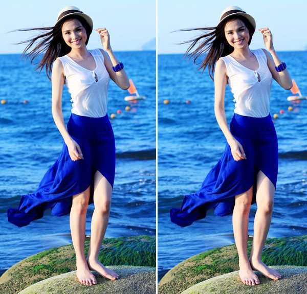 | Dáng váy đuôi tôm như Diễm Hương cũng là lựa chọn lý tưởng cho bạn gái những ngày đi biển. |