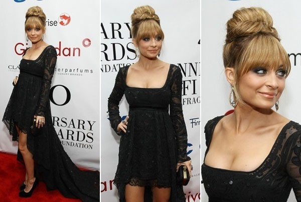 | Nicole Richie toát lên vẻ đẹp sang trọng với đầm đuôi tôm ren màu đen khoét cổ rộng cùng tóc búi cao gọn gàng. |