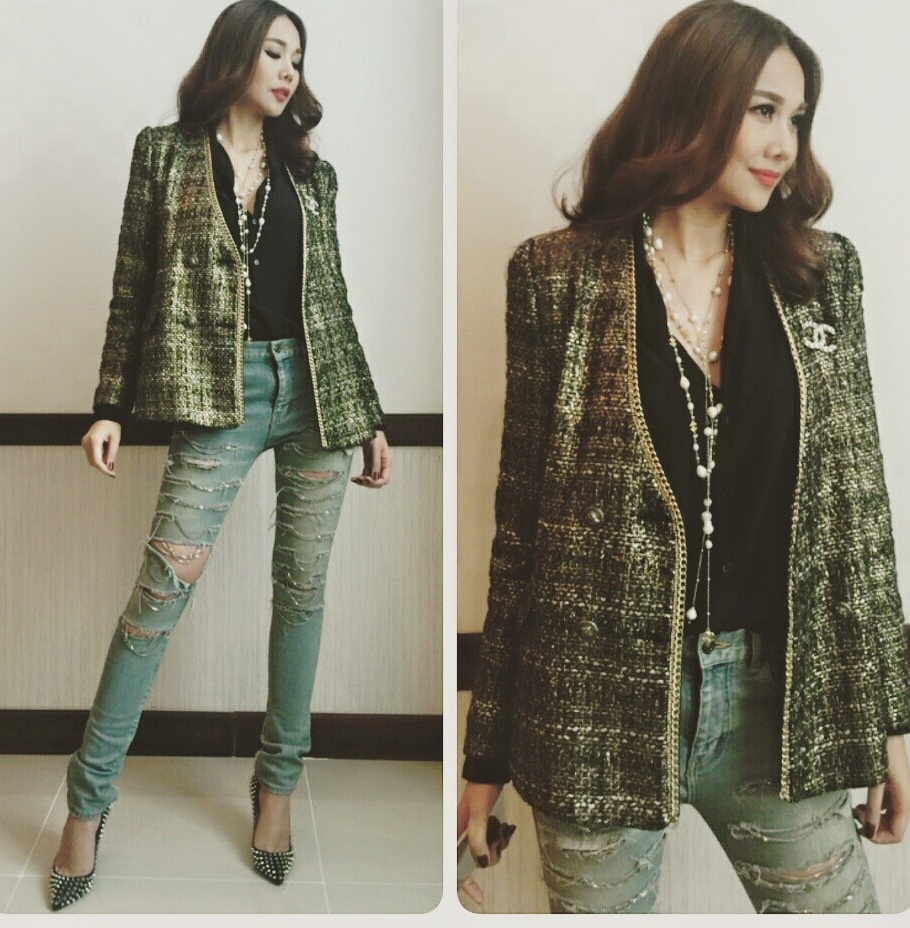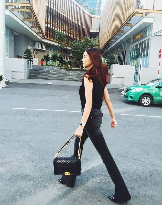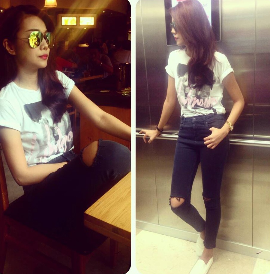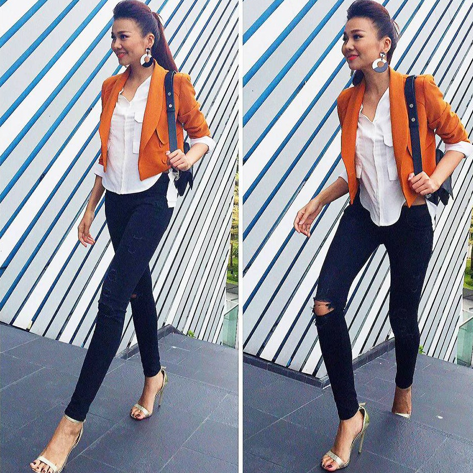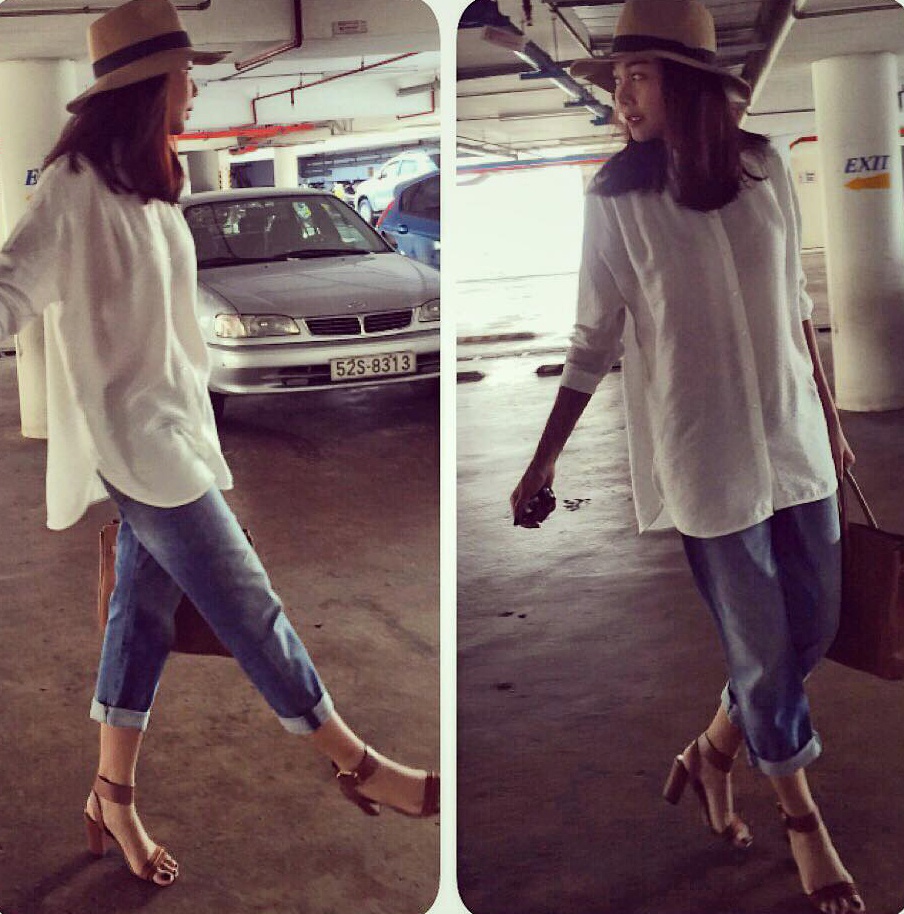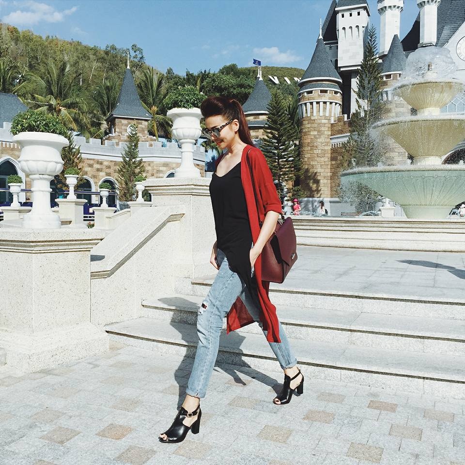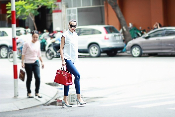 | Những mẫu quần jeans đơn giản không có gì ấn tượng nhưng nhờ cách kết hợp khéo léo cùng sơ mi và áo vest mỏng, Thanh Hằng nhìn rất chất. |
