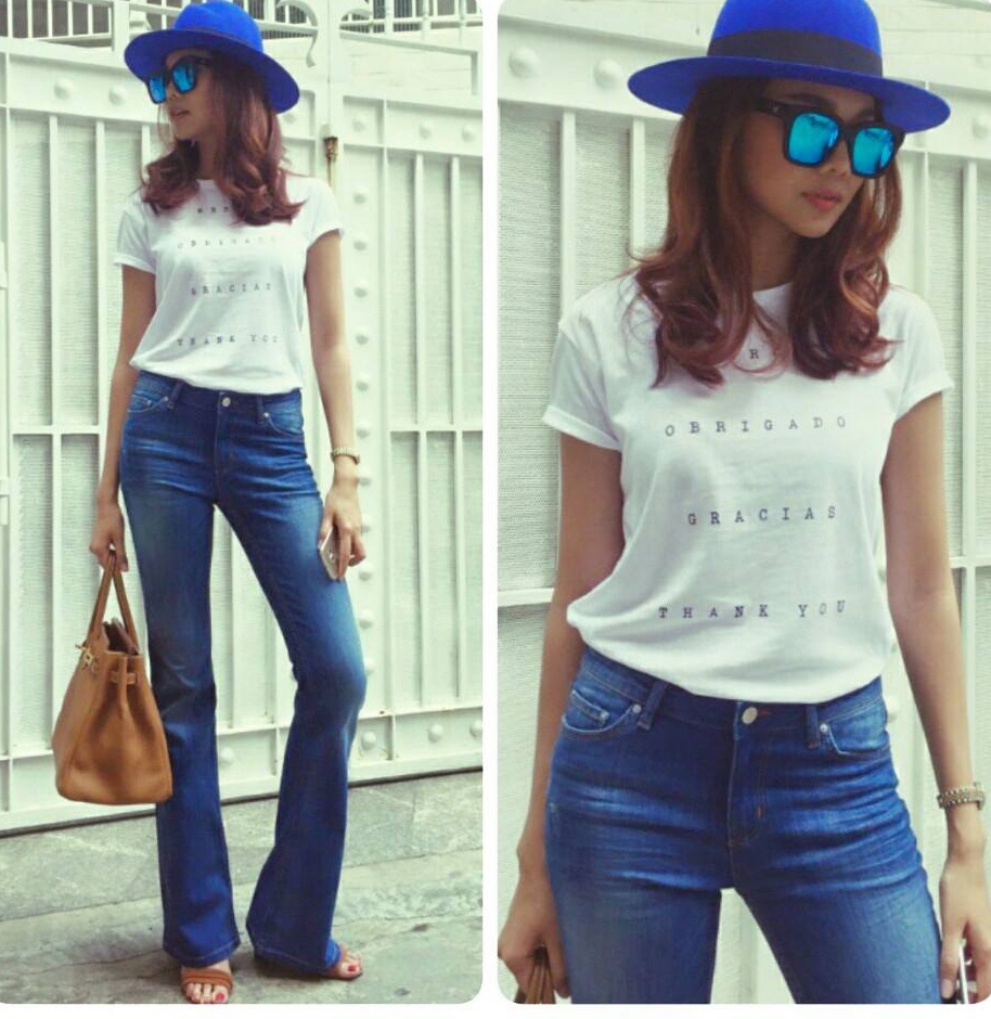 | Một ngày năng động của người đẹp với cách mix rất đơn giản từ quần jeans loe, áo thun trắng và mũ fedora. |