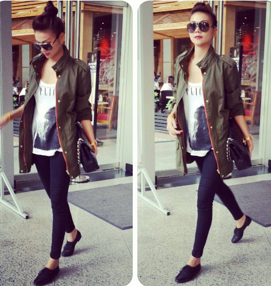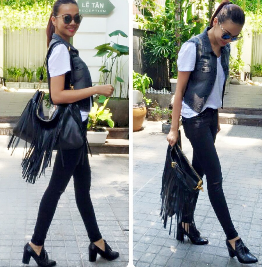 | Thanh Hằng cũng thích những bộ thời trang cả cây jeans như cách mix quần skinny và áo gi-le khỏe khoắn này. |
