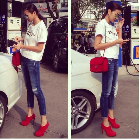 | Quần jeans kết hợp cùng phụ kiện đỏ nổi bật trên phố của Thanh Hằng. |