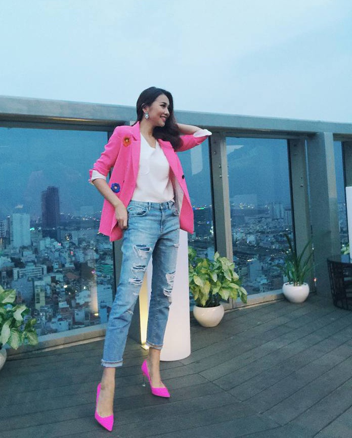 | Quần jeans rách mix kèm blazer hồng và giày đồng màu giúp tôn vẻ sành điệu của người mặc. |