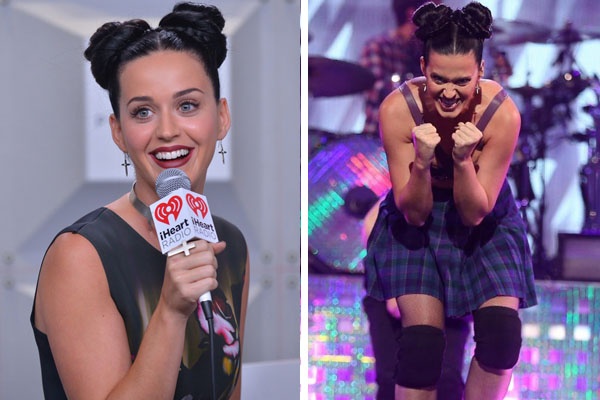 | Katy Perry trông rất ngộ nghĩnh và nhí nhảnh với kiểu tóc búi cao hai bên. |