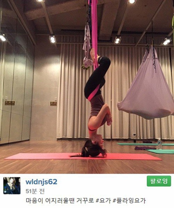 | Ca sĩ Jiwon của nhóm SPICE khoe trên trang cá nhân bức ảnh chụp cô trong lúc tập yoga bay. Jiwon khiến cư dân mạng thán phục vì tư thế điêu luyện. |