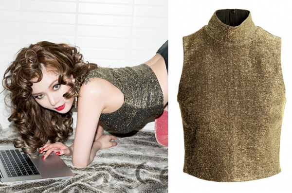 | Trên tạp chí Ceci, ca sĩ HyunA khoe vẻ đẹp nóng bỏng. Cô diện chiếc áo ánh kim giá 40 USD của thương hiệu H&M. Chất liệu sequin cùng kiểu dáng cổ điển đã tôn vinh dáng vẻ sexy của người mặc. |