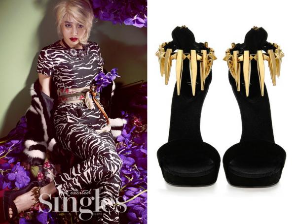 Phong cách giày luxury được HyunA ưa chuộng. Thành viên nhóm nhạc 4Minute chọn cách mix sành điệu với bộ jumpsuit họa tiết. Thiết kế có điểm nhấn tại cổ chân có giá 1.425 USD.