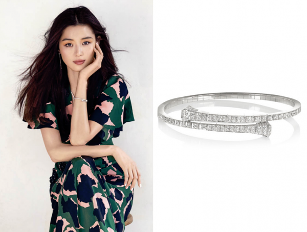 | Trên tạp chí Elle, “mỹ nhân trái đất” Jun Ji Hyun giới thiệu chiếc vòng tay nạm kim cương sang trọng. Sản phẩm thuộc BST mới của Gucci, có giá bán là 13.200 USD. Chiếc vòng nhỏ nhắn hoàn toàn phù hợp với vẻ trẻ trung, quyến rũ của diễn viên Vì sao đưa anh đến. |
