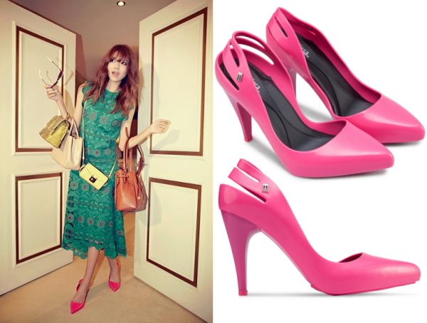 Soo Young (SNSD) nổi bật trong set trang phục bắt mắt. Thiết kế giày sắc hồng neon ấn tượng, kiểu dáng cách điệu sáng tạo chỉ có 176 USD.