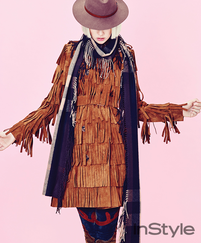 | Uee và áo poncho giá $3.295 của Burberry. |