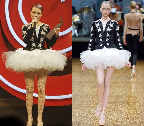 | Năm 2007, Dung Tổ Nhi cũng bị chỉ trích không ít vì chiếc váy copy 100% của Viktor & Rolf. |