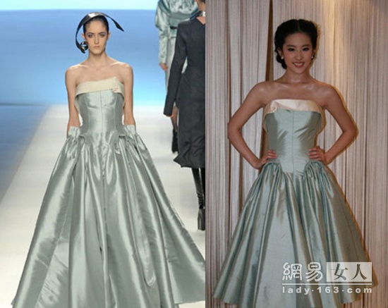 | Nổi tiếng, có gia thế và được người hâm mộ trìu mến là ngọc nữ nhưng Lưu Diệc Phi phải mang danh "công chúa hàng nhái". Năm 2008, thiết kế cao cấp của Louis Vuitton được người đẹp "lấy cảm hứng" tạo thành chiếc váy ngắn kém sang, nếp gấp ở trước ngực cũng được đổi bên. |