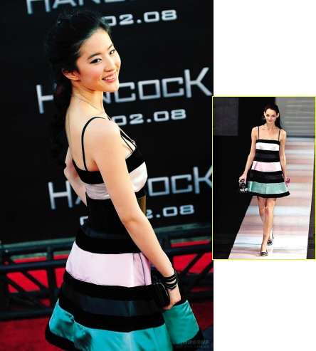 | Tại sự kiện ra mắt phim Hancock năm 2008, Lưu Diệc Phi tiếp tục là tâm điểm chú ý khi diện chiếc váy nhái của Armani. |