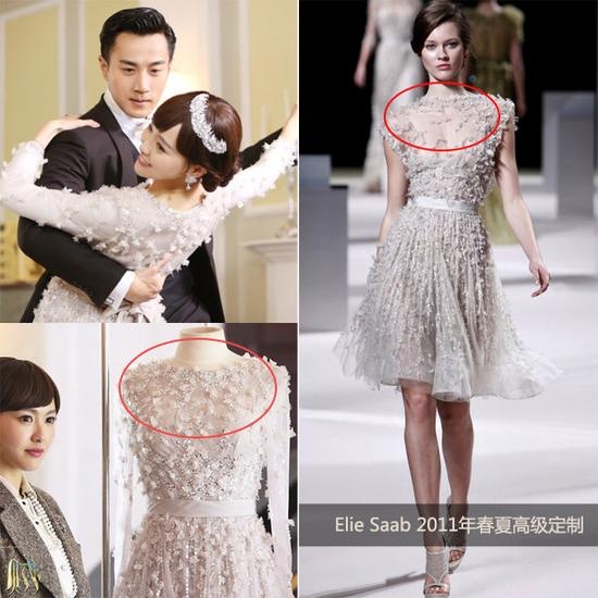| Chiếc váy Đường Yên diện trong Thiên kim nữ tặc (2015) giống thiết kế của Elie Saab năm 2011 đến 90%, chỉ khác ở đường cổ và phần đính hoa trước ngực. |