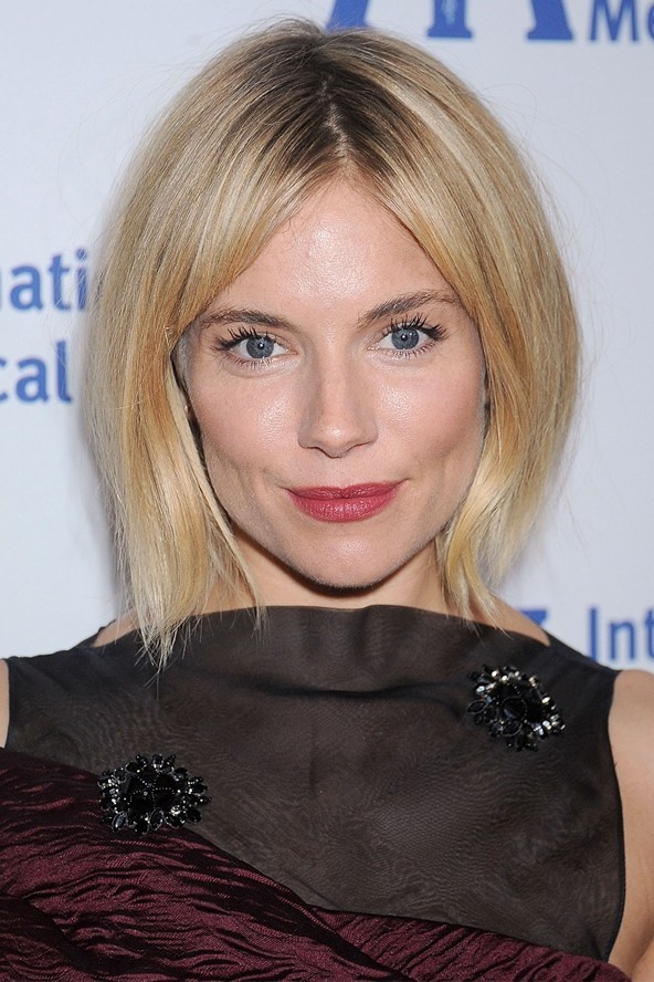 Sienna Miller ăn gian tuổi với kiểu tóc bob rẽ ngôi giữa trẻ trung. |