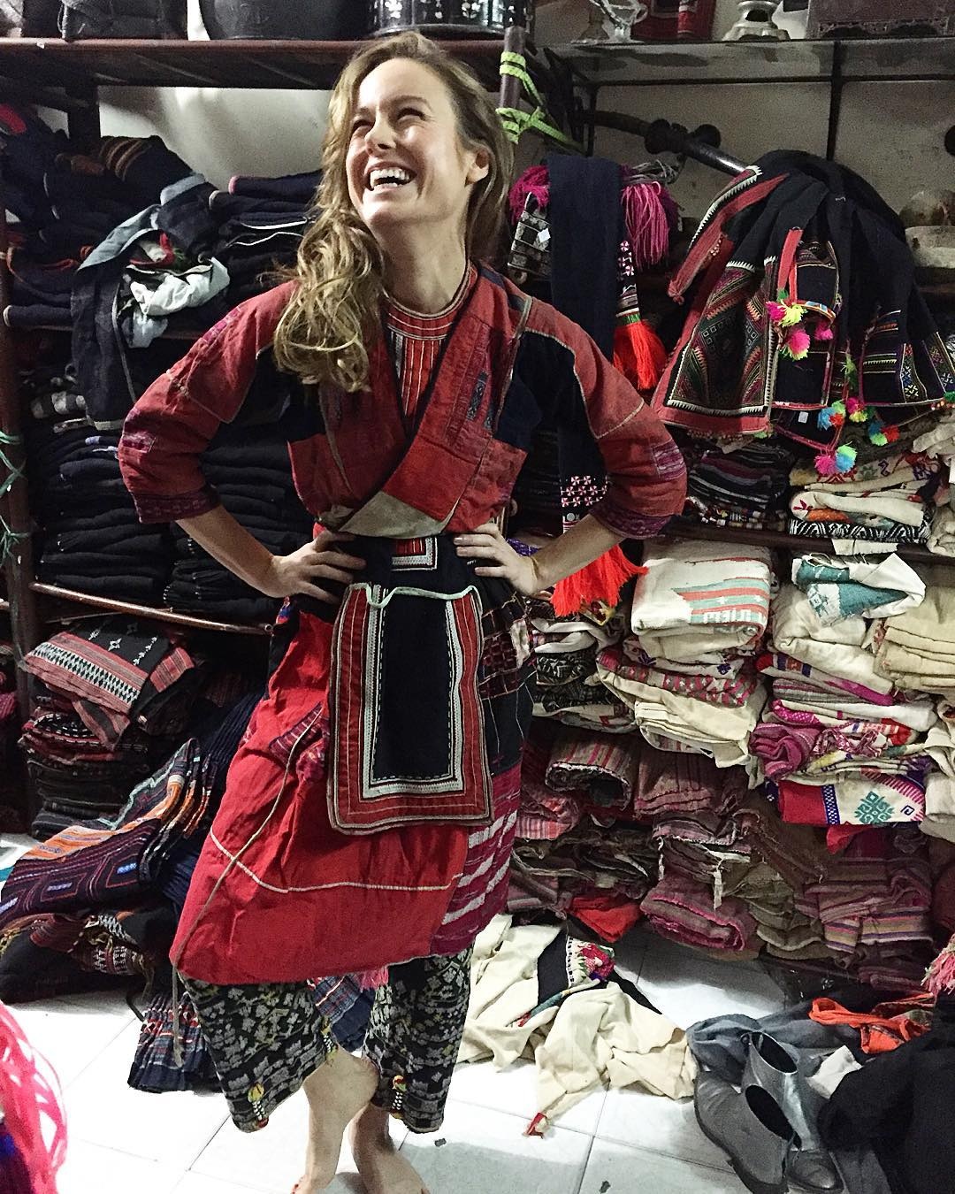 Brie Larson thích thú thử trên mình bộ đồ thổ cẩm của người Hmong khi ở Việt Nam và cô tiết lộ rằng mình sẽ tìm hiểu về dân tộc này. Ảnh: Briestatic |