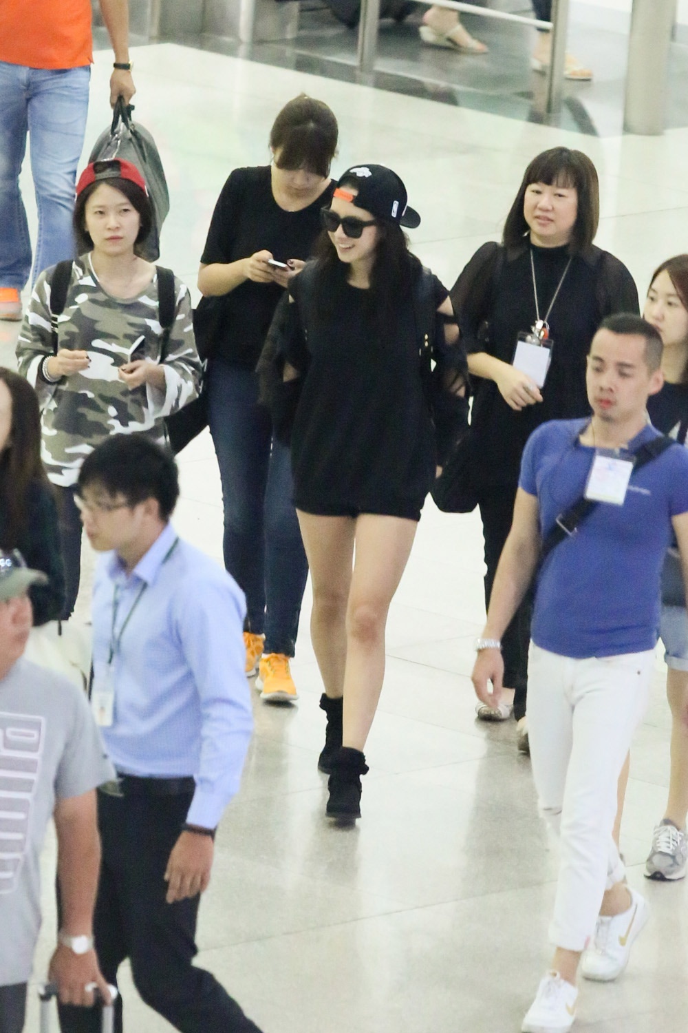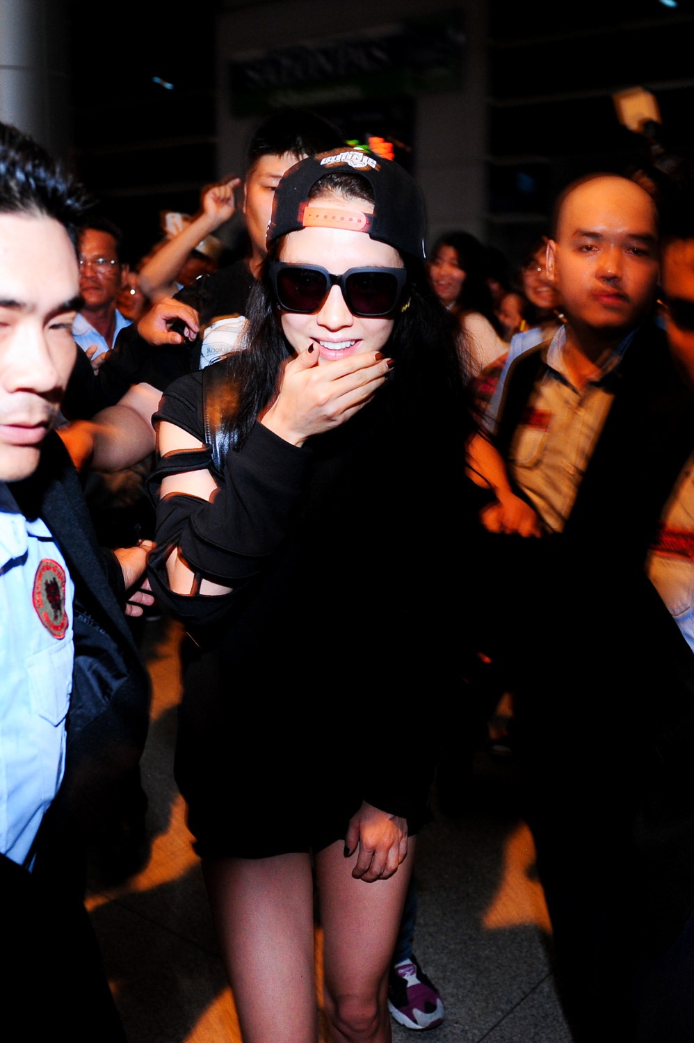 Song Ji Hyo được các vệ sĩ đưa lên xe về khách sạn nghỉ ngơi để chuẩn bị cho lịch trình dày đặc tại Việt Nam. Ngôi sao 34 tuổi từng tham gia một số bộ phim nổi tiếng của xứ kim chi như Hoàng cung (2006), Jumong (2007), Sex is Zero 2 (2007).