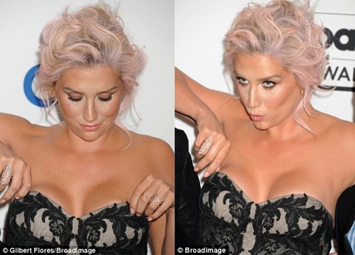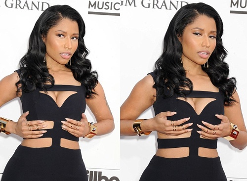 | Nicki Minaj tìm mọi cách để phần ngực của váy nằm yên vị, không bị xộc xệch. |
