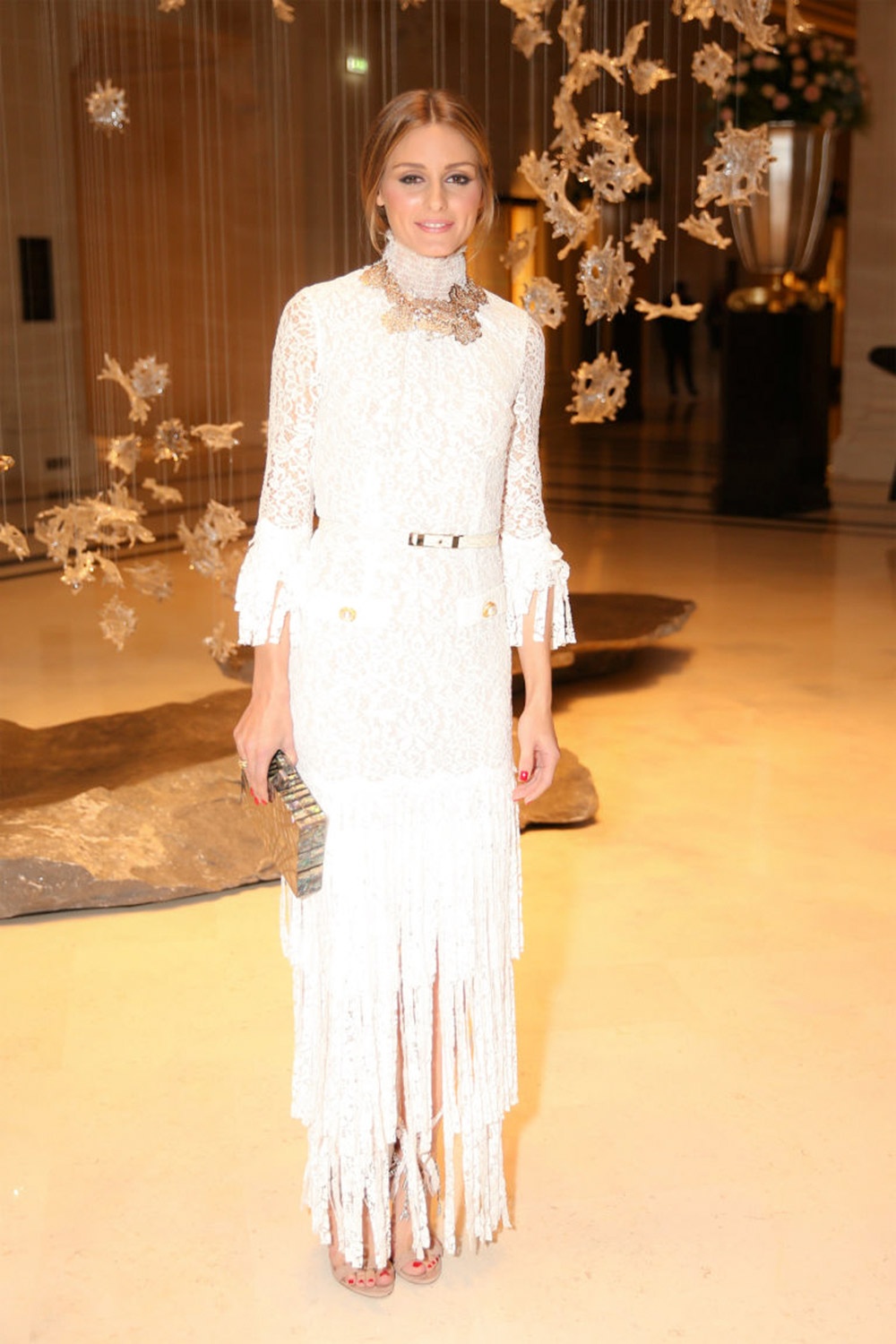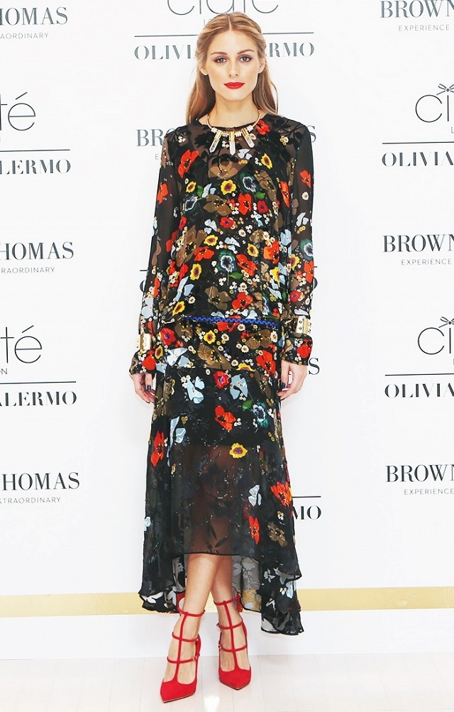 | Olivia Palermo sang trọng với váy họa tiết của Preen by Thornton Bregazzi. Chiếc vòng cổ kiểu cách và giày cao gót đỏ phù hợp với những nàng độ tuổi 30. |