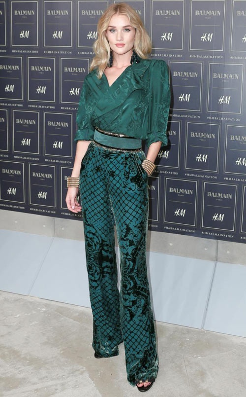 | Rosie Huntington-Whiteley diện một cây màu xanh lục bảo nổi bật tại bữa tiệc. |
