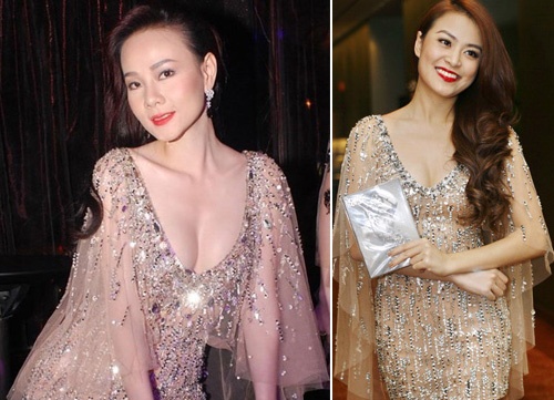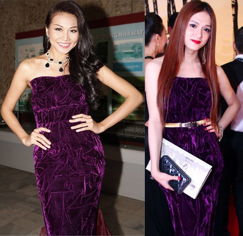 | Thanh Hằng và Hương Giang Idol mỗi người một vẻ trong chiếc đầm dạ hội màu tím. |