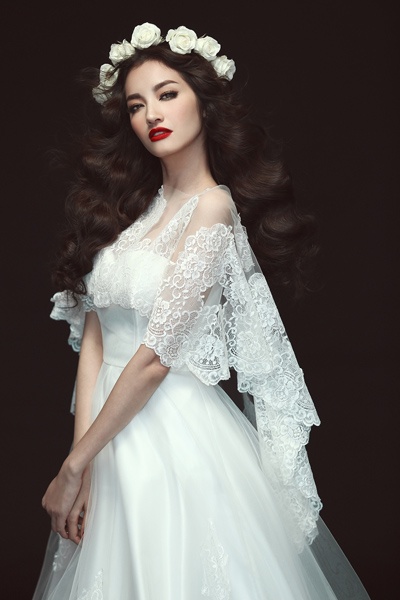 Hoa hậu Thời trang Trúc Diễm đội vòng hoa màu trắng khá phù hợp với mẫu váy cưới đồng tông chất liệu ren lưới quyến rũ.
