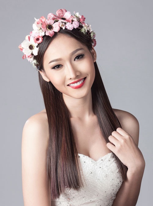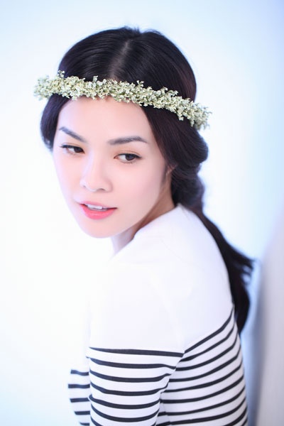 Với những khung ảnh thực hiện trong studio, người đẹp cũng vận dụng phong cách này. Vòng hoa li ti nhỏ nhắn được đặt khá duyên dáng trên mái tóc suôn dài.