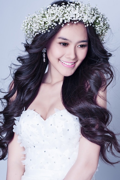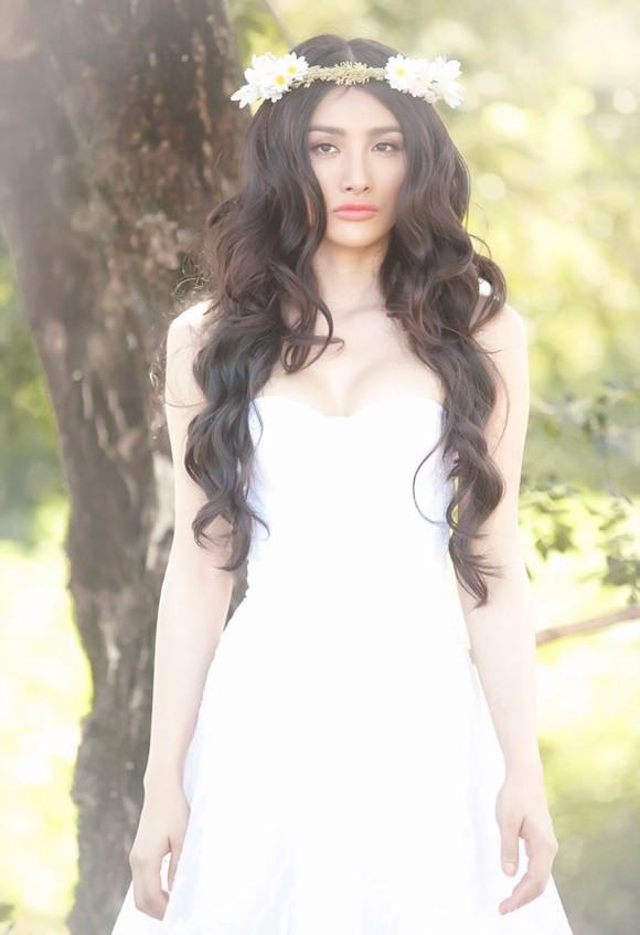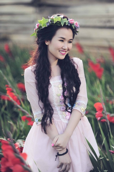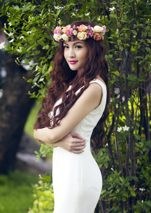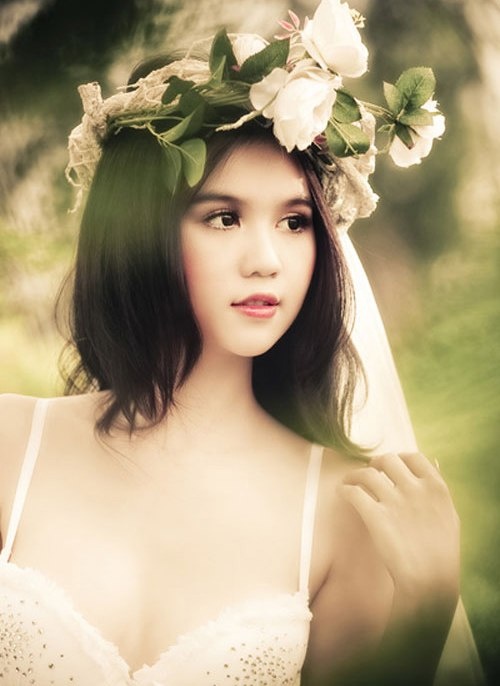 Khuôn mặt xinh xắn, cùng biểu cảm trong sáng của Ngọc Trinh rất phù hợp với phong cách lãng mạn, có vòng hoa kết trên tóc.
