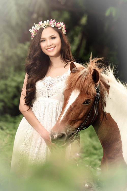 Đầu năm 2014, Hoa hậu Diễm Hương trông nữ tính và hoang dã hơn với concept chụp ảnh cùng ngựa. Bộ ảnh có concept chụp ngoài trời giúp cô khoe khéo vẻ đẹp trong trẻo, duyên dáng khi diện váy trắng, đội vòng hoa lãng mạn.