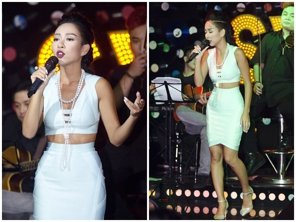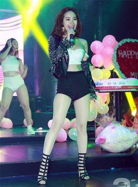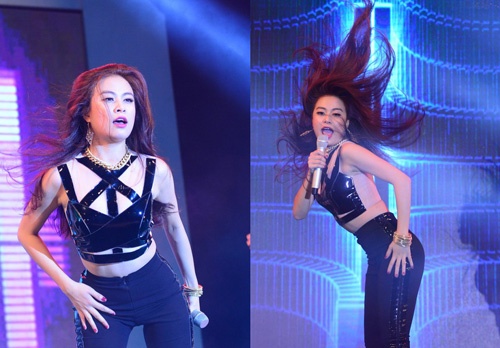 | Minh Hằng nóng bỏng trên sân khấu với trang phục gợi cảm. Mốt áo bra-top được giọng ca Sắc môi em hồng ứng dụng hiệu quả trong trường hợp này. |