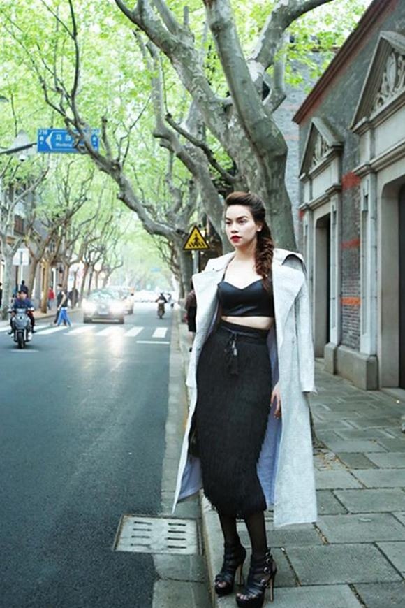 | Trong một dịp công tác tại Trung Quốc, Hồ Ngọc Hà mix tinh tế giữa bra-top ngắn và chân váy tua rua hợp mốt. Phụ kiện giày sandals cao cổ hiện đại cùng áo măng-tô gam màu xám khoác ngoài giúp tổng thể thêm phần sành điệu. |