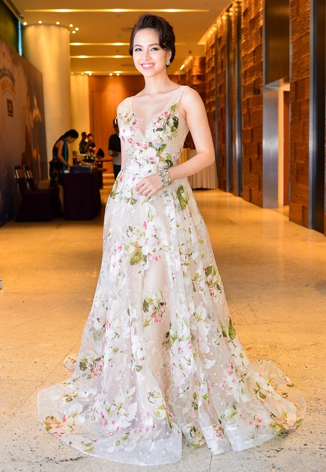 | Trước đó, Đinh Ngọc Diệp từng mặc bộ váy này khi tham gia buổi họp báo ra mắt chương trình Bước nhảy ngàn cân. Thiết kế trang nhã, hài hòa với vẻ đẹp nữ tính, quyến rũ của bà xã đạo diễn Victor Vũ. Ảnh: Nguyễn Thành |