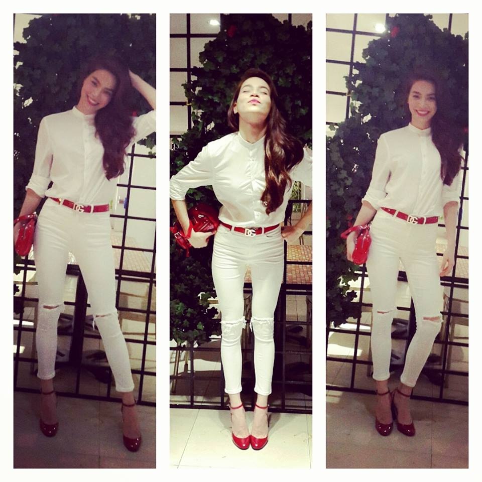 | Trang phục street style của ''nữ hoàng giải trí'' Hồ Ngọc Hà hướng đến vẻ đẹp thanh lịch, nhã nhặn trong tuần vừa qua. Bà mẹ một con diện áo sơ-mi trắng kèm quần jeans cạp cao khi xuống phố. Phụ kiện giày, thắt lưng, túi xách có gam màu đỏ nổi bật, bắt ánh nhìn. |