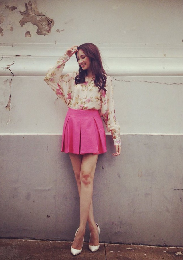 Bộ trang phục áo sơ-mi họa tiết in hoa và chân váy xếp ly gam màu hồng được cho là ăn nhập với hình ảnh nữ tính, thời trang của hoa hậu Trúc Diễm.