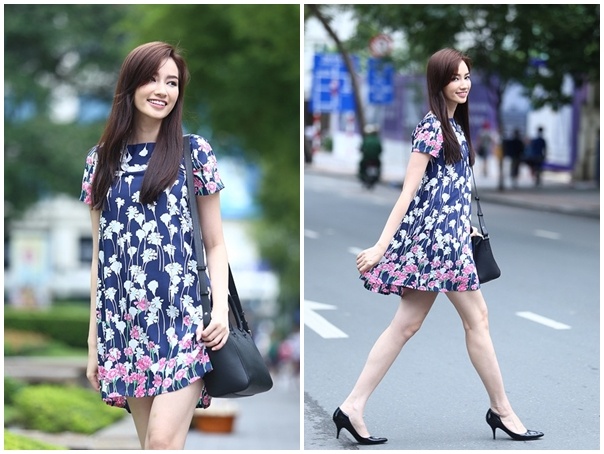 Một ngày khác, chân dài diện bộ váy suông in họa tiết hoa mùa hè thanh thoát khi dạo phố Sài Gòn.