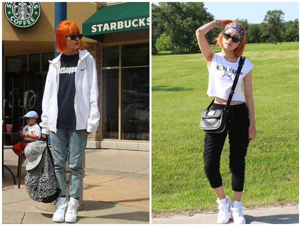 Trong khi đó, ''Én chị'' diện mẫu áo kimono dáng dài, chân đi giày thể thao đế thô, phụ kiện mũ fedora đi kèm ăn nhập cùng trang phục.